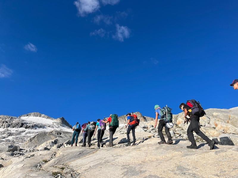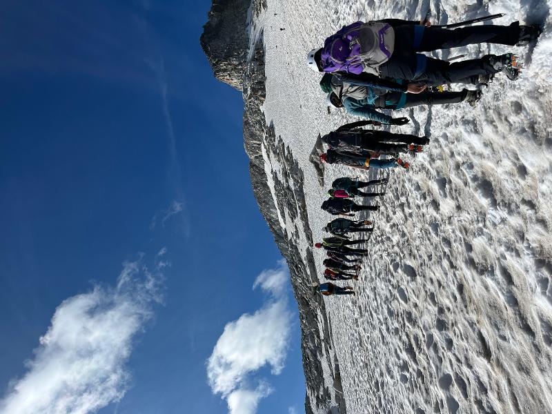 Nous continuons à marcher jusqu'au refuge gardé de Renclusa en admirant l'impressionnant glacier qui se trouve devant nous. Nous nous installons et passons à table ! Après le repas, nous recevons des explications techniques sur la façon dont nous allons faire l'ascension de l'Aneto (3 404 m) demain, le point culminant des Pyrénées.